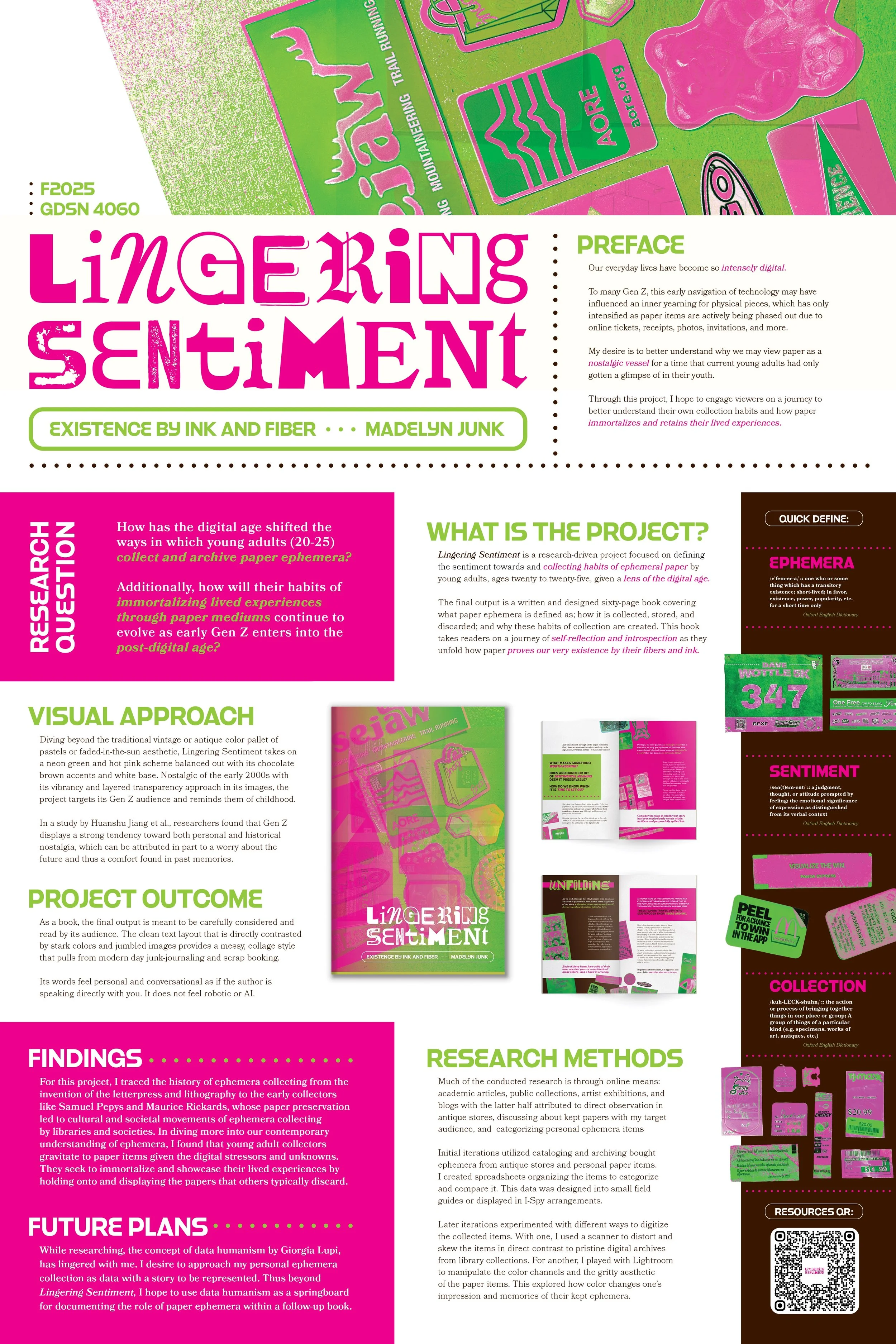 Lingering Sentiment is a research-driven project focused on uncovering how ephemeral paper is collected and conceptualized by young adults, ages twenty to twenty-five, given the lens of the digital age. The final output is a written and designed paperback book defining paper ephemera; dissecting how and why it is collected, stored, and discarded; and analyzing how these papers contribute to a greater sense of collective humanity.