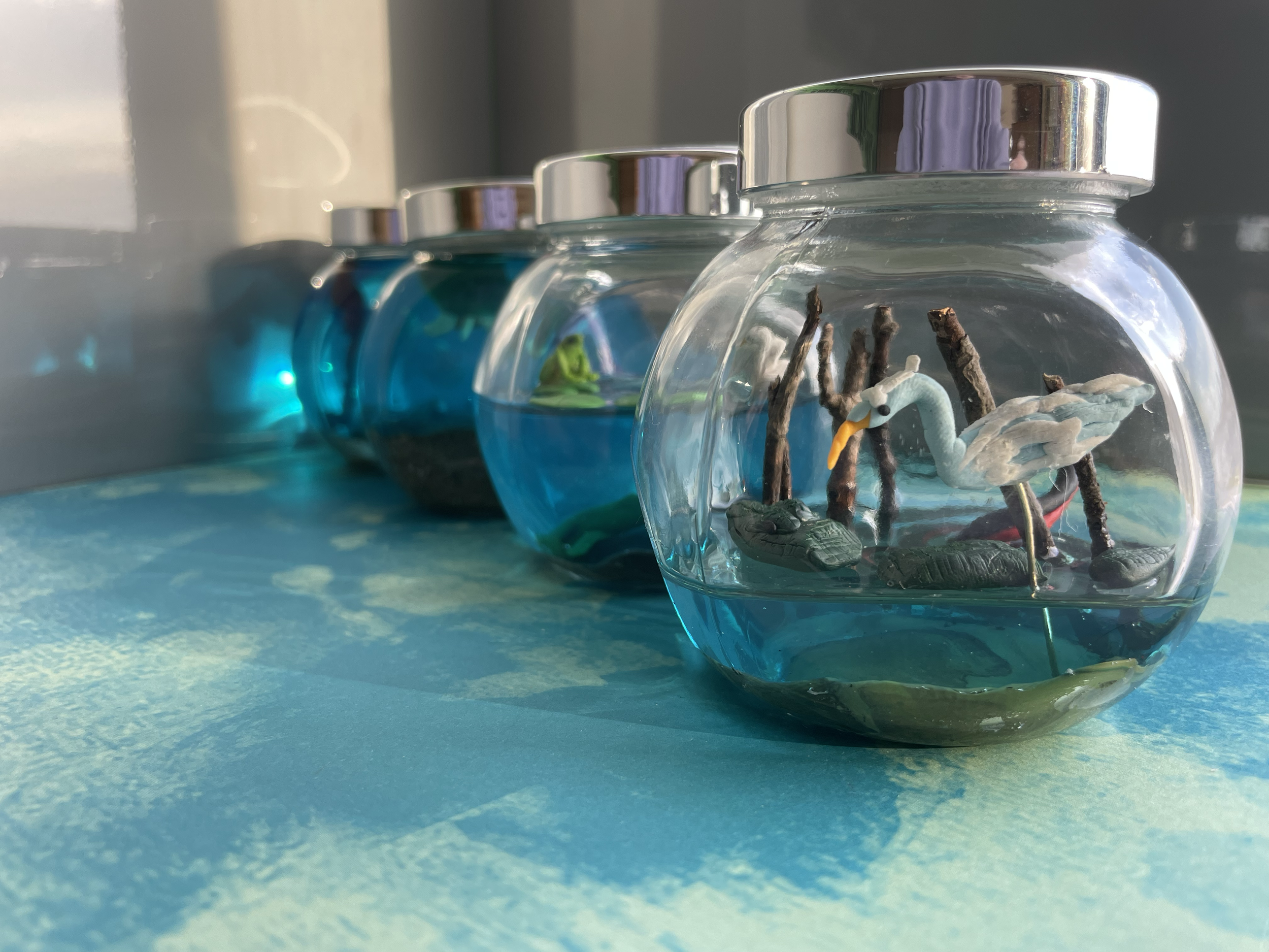 The product itself consists of four, fishbowl shaped glasses filled with resin, sand, sticks, and handmade polymer clay animals. Ribbons are tied around the neck of the glasses to give a three dimensional element to them.