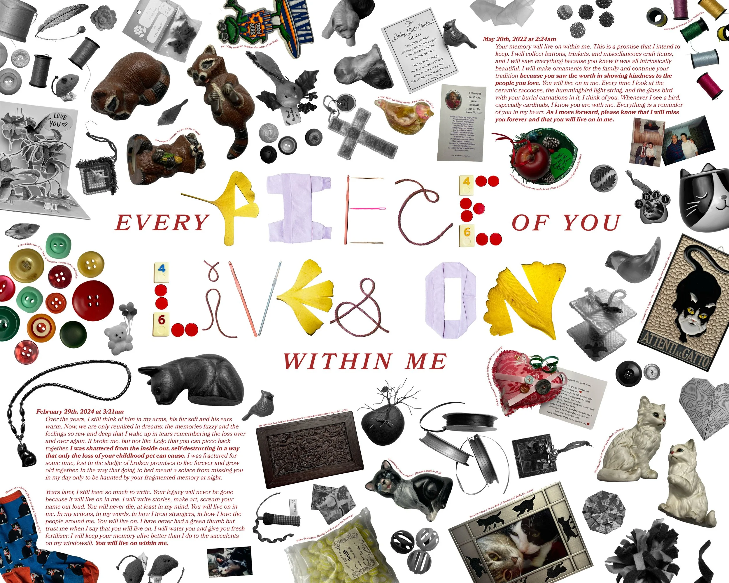 With most of the objects depicted in black and white, color is used to emphasize certain objects with deep significance. These objects feature a small caption about what it is and how it is tied to them. Within the clustered objects, two paragraphs sit on the top right and bottom left featuring journal entries about their impact in my life and about how I will preserve their legacy within all that I do.