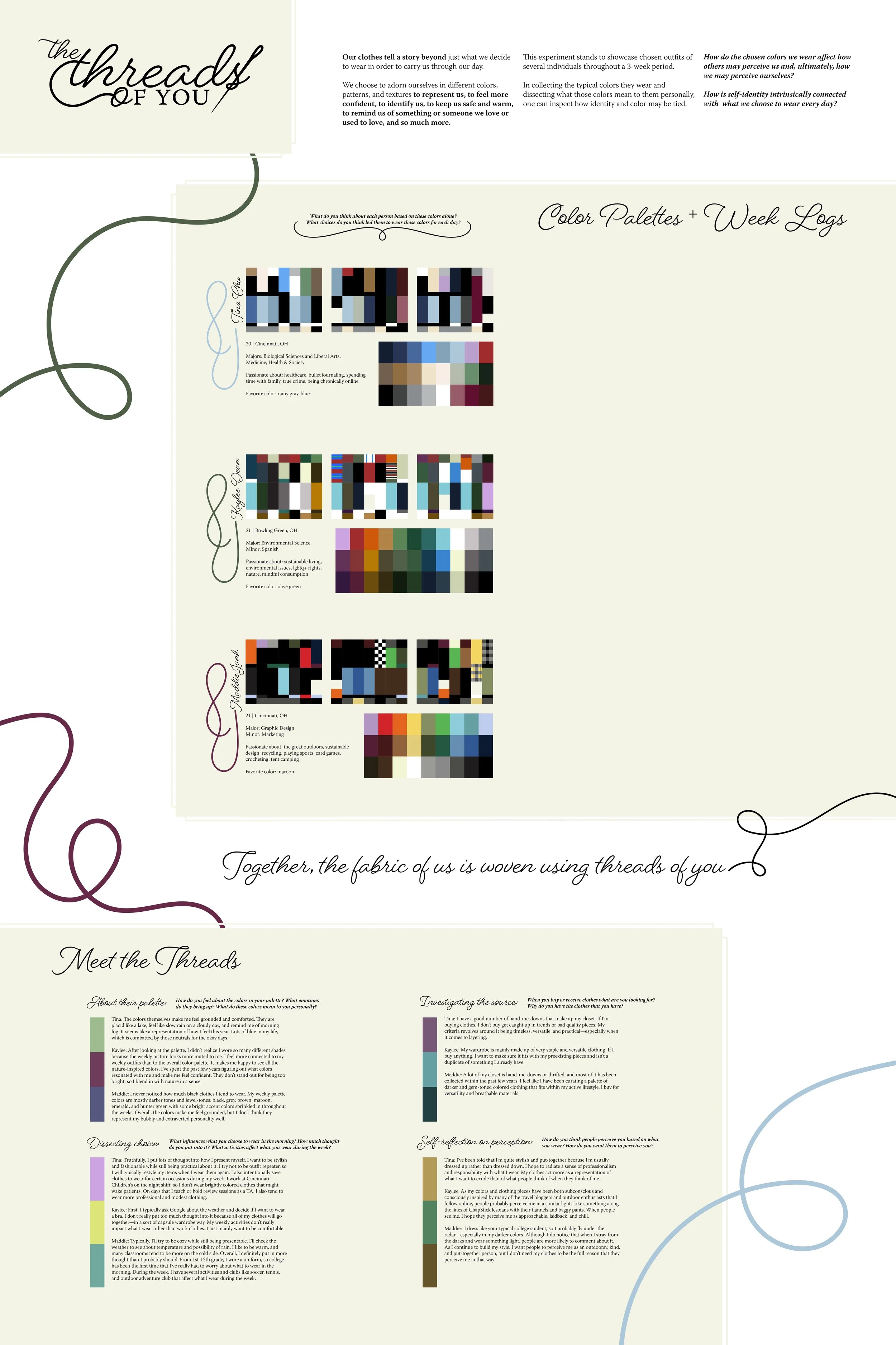 Altogether, the project is focused on calling attention to an otherwise somewhat-subconscious process like “what colors do I wear today?”. In hopes to showcase three, unique individuals and their thought processes and styles, this project is able to dive into different perspectives and stories.
