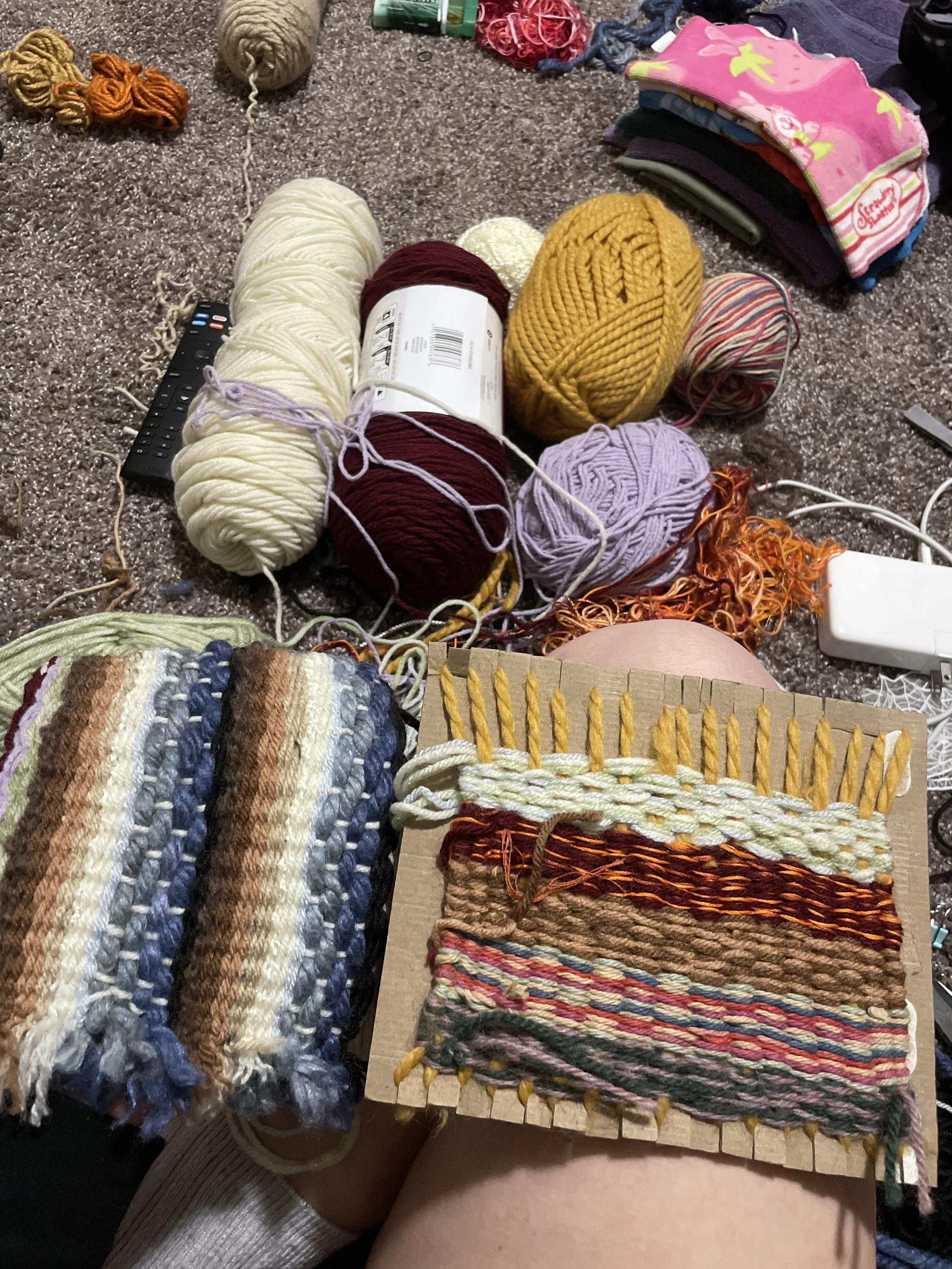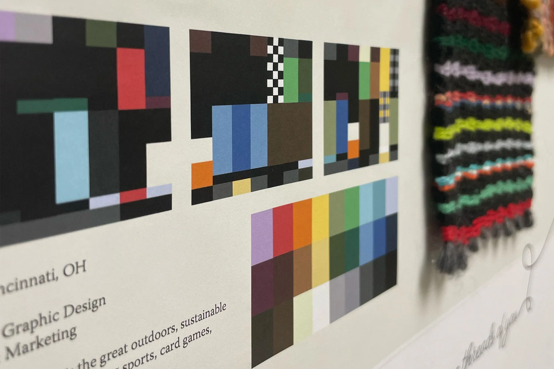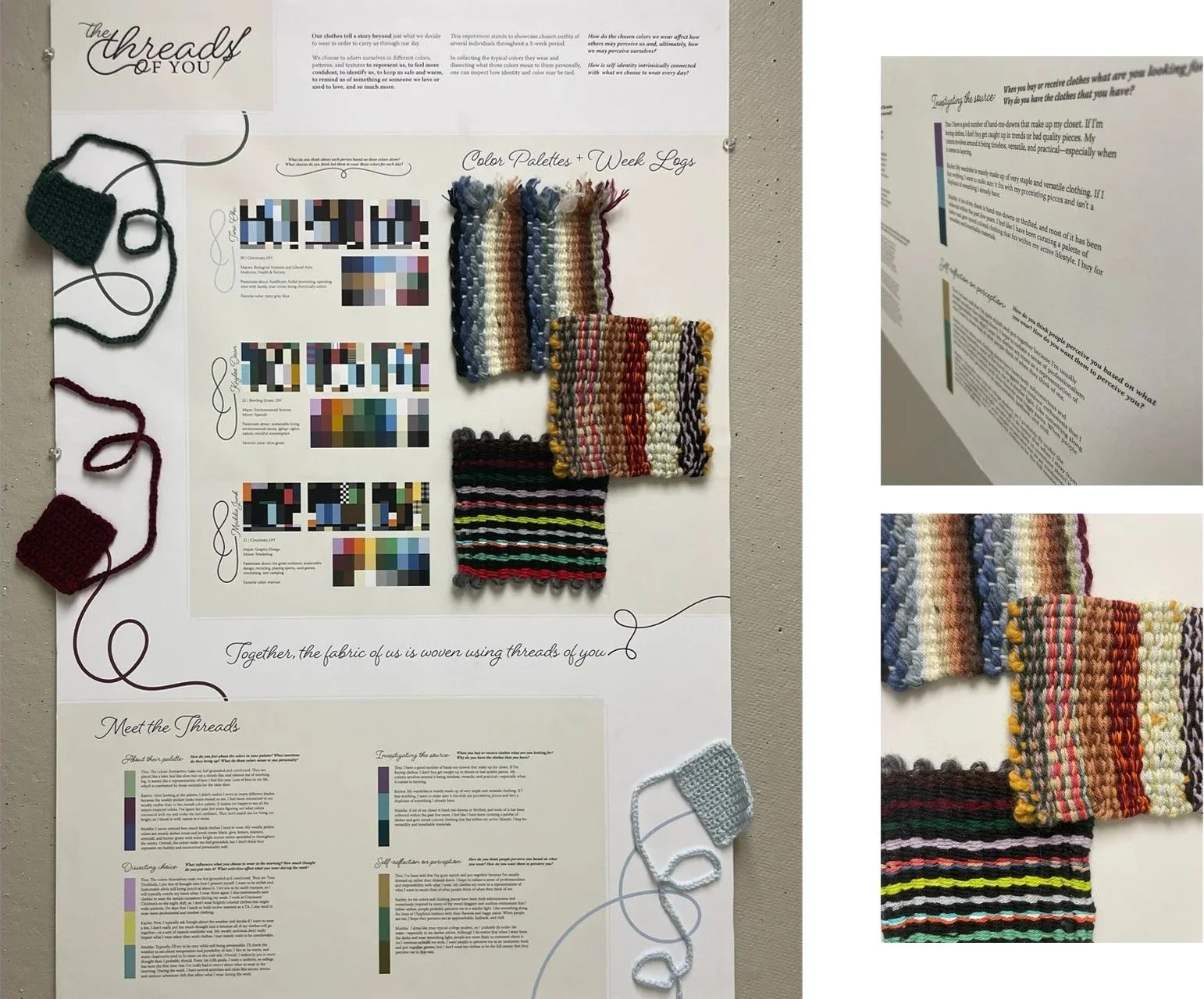 After collecting the weekly data, there was an interview process about understanding the choices made in every aspect from buying to wearing to re-wearing during the week. An additional focus for this experiment was dissecting self-perception of the colors one wears and the perception from others. To represent the data, three squares were hand-woven from collected yarn using a makeshift cardboard loom. Each woven square contains colors found in everyone’s palettes and reflects part of their identity and clothing choices within the composition. The use of fiber materials tied into the core themes of expression through color, texture, and pattern.